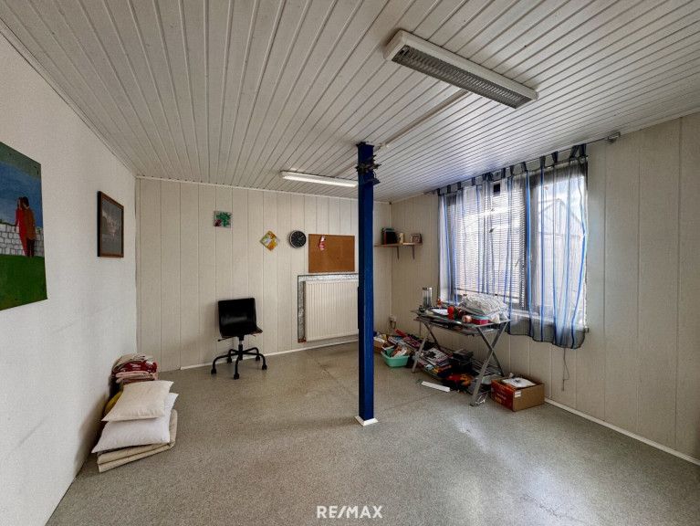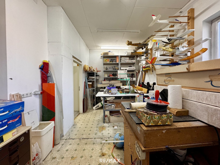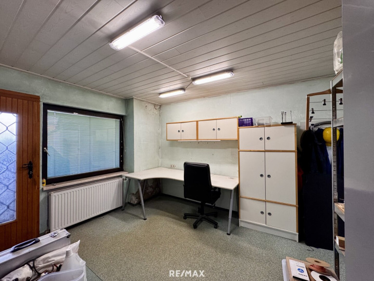 Im Erdgeschoss dieses Einfamilienhauses stehen ca. 238 m² Nutzfläche zur Verfügung. Diese gliedert sich in eine großzügige Werkstatt, 2 Büroräume sowie 6 Lagerräume.