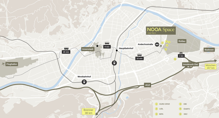 Das Gewerbegebiet Rossau ist heute das wirtschaftliche Rückgrat Innsbrucks, geprägt von einem vielfältigen Branchenmix - von Produktion und Handwerk bis zu Handel, Logistik und ersten innovationsorientierten Unternehmen. Mit dem Auto und dem Fahrrad erreicht man das Stadtzentrum und den Hauptbahnhof in 10 Minuten, ebenso die östlichen Stadtteile. Haltestellen der Linien C, F, R, T und N3 befinden sich vor dem Objekt.