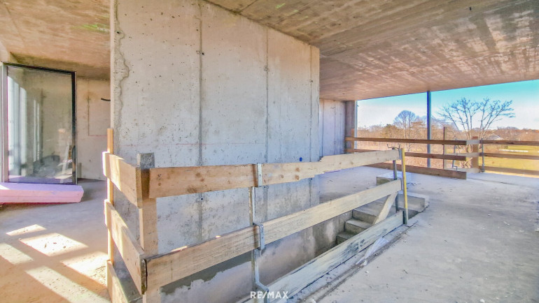 1. OG: Masterbedroom mit Badezimmer (freistehende Badewanne, Doppelwaschtisch, große bodenebene Dusche), Schrankraum, separate Toilette, 2 weitere Zimmer, zweites Badezimmer (Badewanne, Doppelwaschtisch, große bodenebene Dusche, WC, WM-Anschluss), Aufzug, Treppe ins Obergeschoss, Luftraum, großzügige Verglasungen