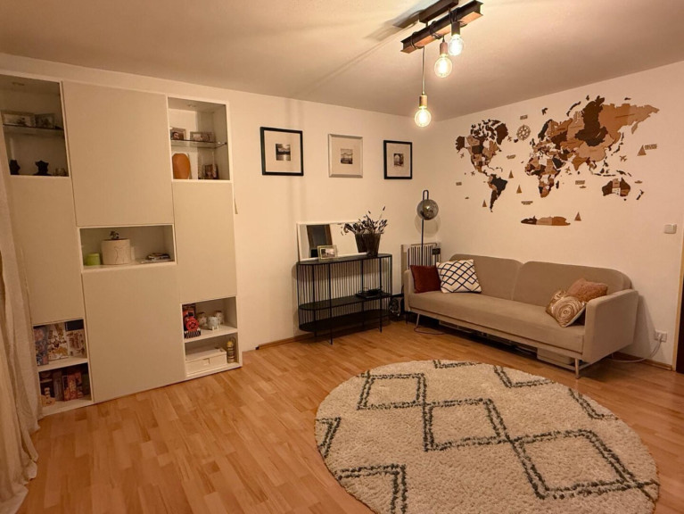 Das Wohnzimmer präsentiert sich großzügig geschnitten und bietet ausreichend Platz für Wohn- und Essbereich – ein Raum, der zu gemütlichen Stunden und entspanntem Ankommen einlädt. Von hier aus gelangt man in die separate, gut ausgestattete Küche mit Fenster, ausgestattet mit Cerankochfeld, Backofen und Kühlschrank.