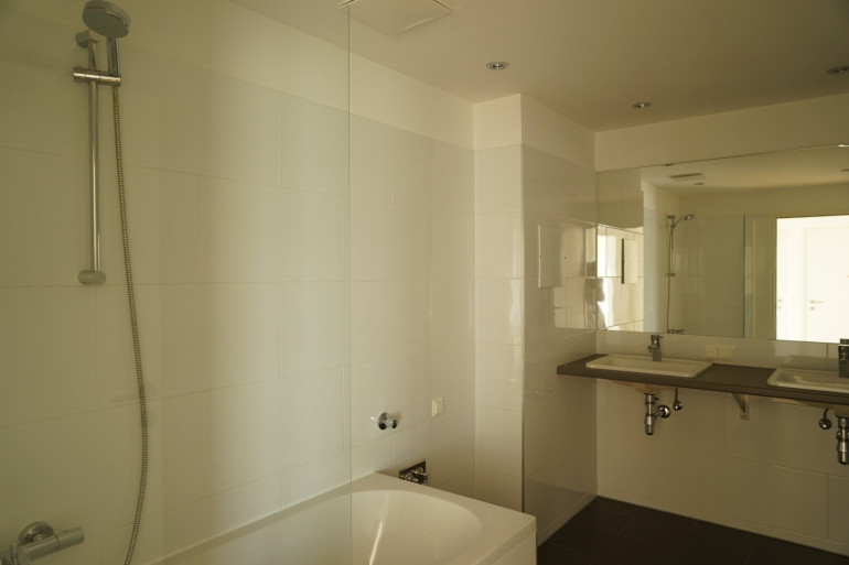 - Badezimmer mit Doppelwaschbecken, Badewanne und Waschmaschinenanschluss
