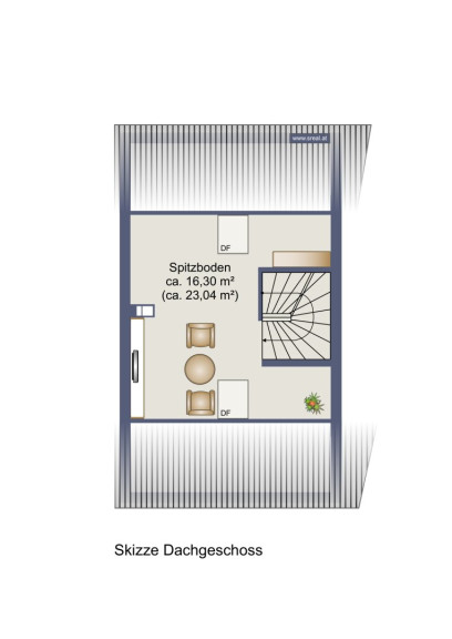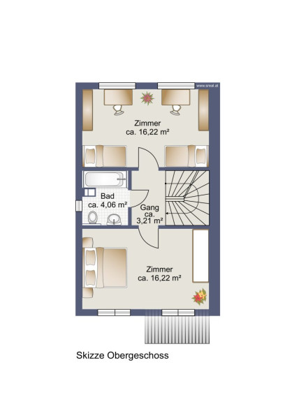 - 2 geräumige Zimmer im Obergeschoß + ein Studio im Dachgeschoß