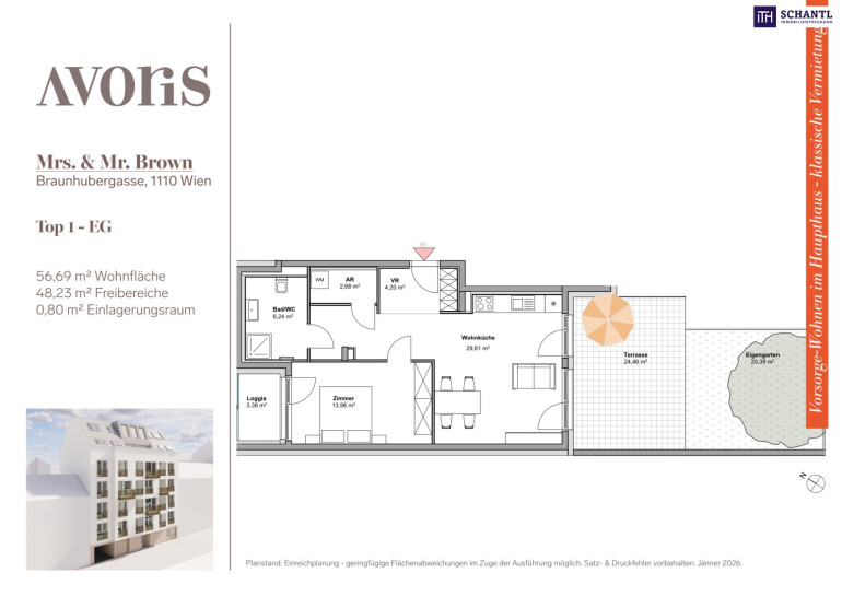 Wohnfläche: ca. 56,69m² + Loggia: ca. 3,38m² + Terrasse: ca. 24,46m² + Garten: ca. 20,39m² + Kellerabteil: ca. 0,8m²