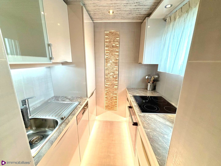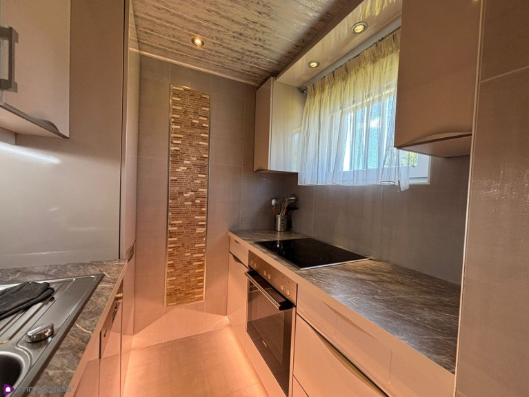 kleine, voll ausgestattete Küche, mit Fenster, Zugang über praktische Glasschiebetür