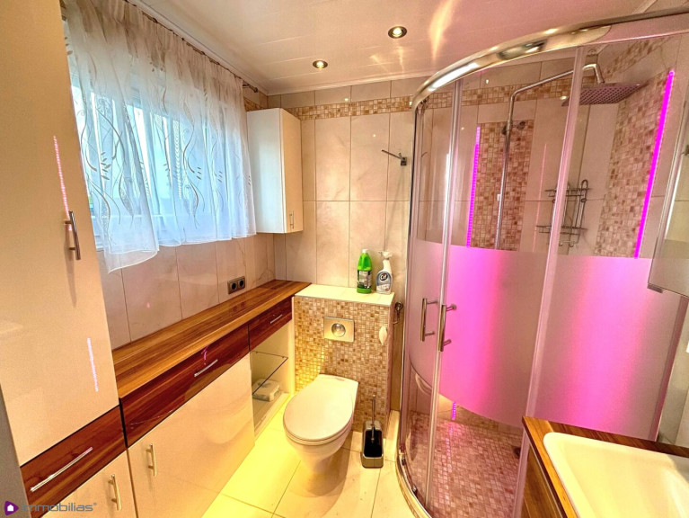 Badezimmer mit Dusche und Waschtisch, WC, mit Fenster, Zugang über Glastür