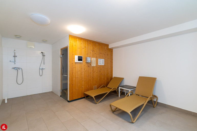 Parkett, Fliesen, Fußbodenheizung, Einbauküche, Personenaufzug, Südbalkon, Badewanne, Tiefgarage, Sauna, Wasch/Trockenraum