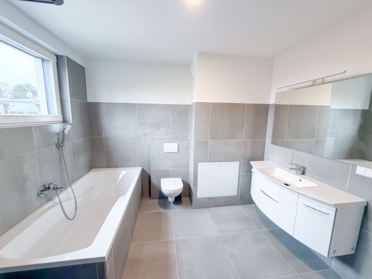 Fliesen, Parkett, Fußbodenheizung, Wohnküche / offene Küche, Bad mit Fenster, Badewanne, Dusche, Parkplatz