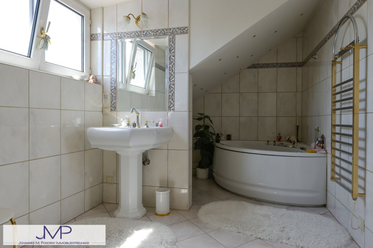 Vom Schlafzimmer gelangt man über einen Gang auch in die eigene Sauna, sowie das ebenfalls uneinsichtige Haupt-Bad mit Badewanne, Dusche und integriertem WC.