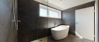 Badezimmer mit freistehender Designer Badewanne und Walk In Dusche