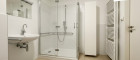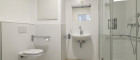 Das Schlafzimmer bietet ausreichend Platz für ein Doppelbett und Schränke. Das Badezimmer ist komfortabel und barrierefrei gestaltet und verfügt über Dusche, Toilette, Waschbecken sowie einen Waschmaschinenanschluss.