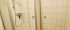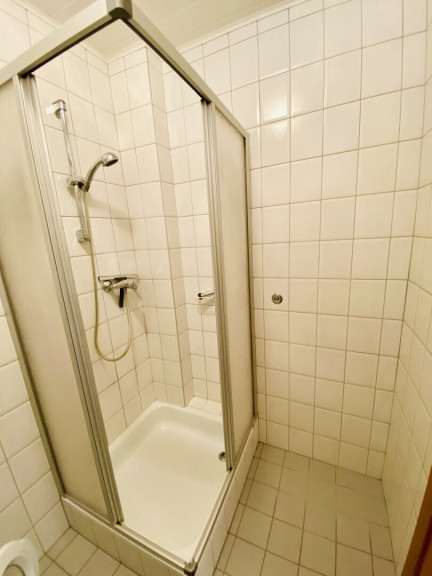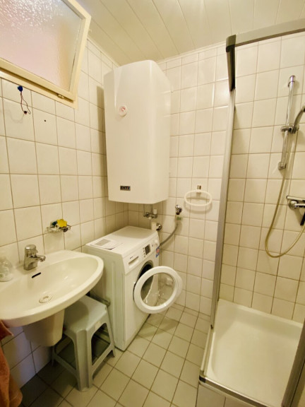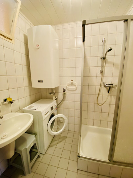 Badezimmer: Funktional ausgestattet mit Dusche, Waschbecken und Waschmaschinenanschluss.