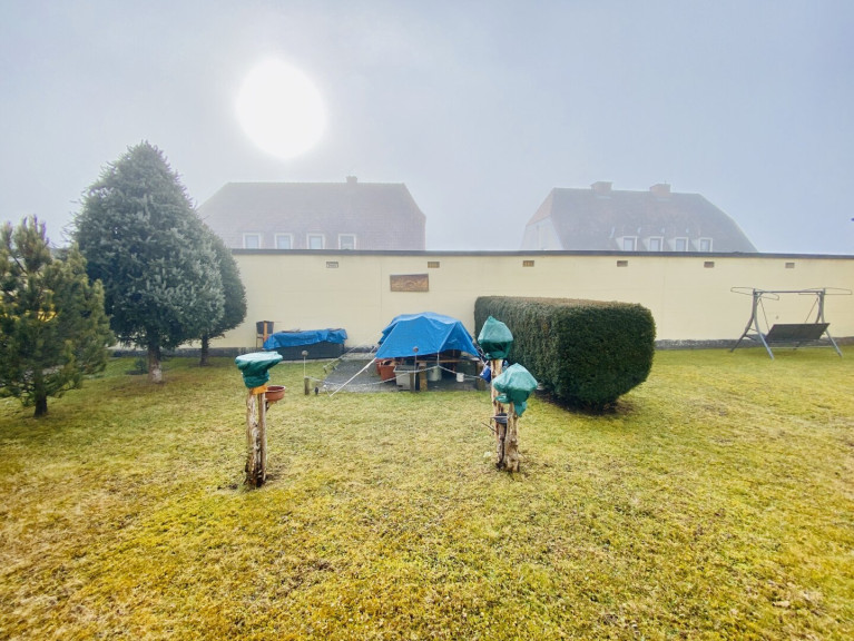 Es steht eine Grünfläche als Allgemeinfläche zur Verfügung, auf der sich die Wohnungseigentümer:innen jeweils eine gemütliche Sitzgelegenheit geschaffen haben, um Zeit im Freien zu verbringen.