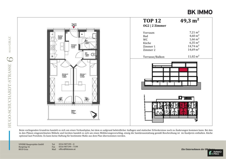 Aufteilung: Vorraum, zwei idente, getrennt begehbare Zimmer, beide mit Zugang zum Balkon, Küche, voll ausgestattet, sowie einem Badezimmer und einem separaten WC.