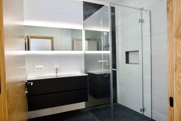 Stilvolles Badezimmer mit Fenster, großzügiger Walk-in-Dusche sowie dimmbarer LED-Deckenleuchte mit integriertem Lautsprecher