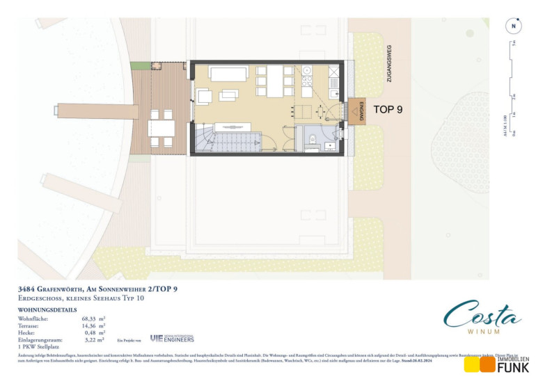 Unmittelbar bei der Zufahrt zu Am Sonnenweiher 2 finden Sie den zum Seehaus 9 gehörenden PKW-Abstellplatz. Von hier gelangen Sie über einen Zugangsweg zum Haus 9 mit dem dazugehörenden außenliegenden Einlagerungsraum nur wenige Schritte vom Hauseingang. Sie betreten das kleine Seehaus 9 in dem ca. 29,80 m² großen zentralen Wohnraum mit Zugang zur eigenen etwa 14 m² großen Lärchenholz-Terrasse mit Ihrem privatem Steg zum See. Linker Hand finden Sie das Gäste-WC und die Haustechnik. Unterhalb der Treppe, die Sie ins Obergeschoss führt, ist ein Abstellraum angeordnet. Im Obergeschoss erwarten Sie zwei Schlafzimmer (ca. 12,80 m² und 10,10 m²) und das etwa 5,50 m² großen Badezimmer mit Waschtisch, WC, Dusche, Fenster und Warmwasserspeicher.
