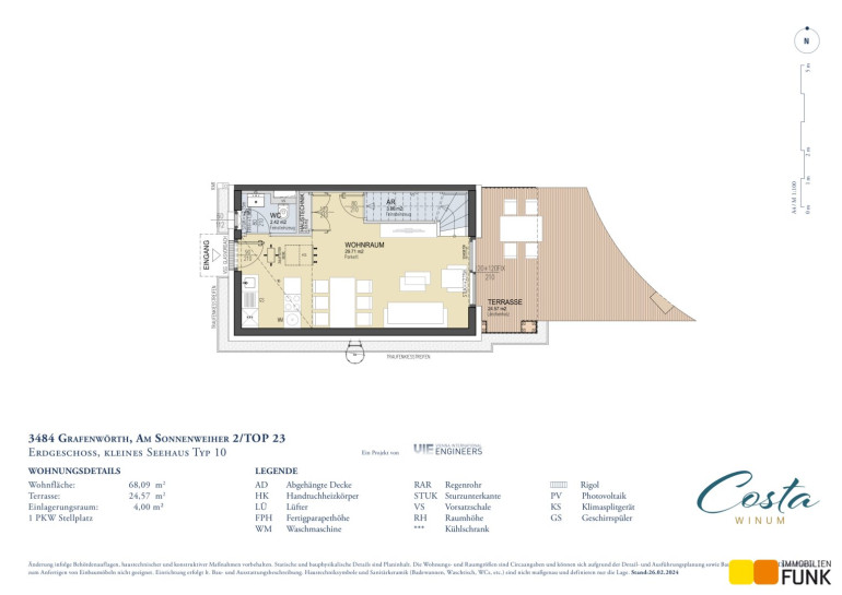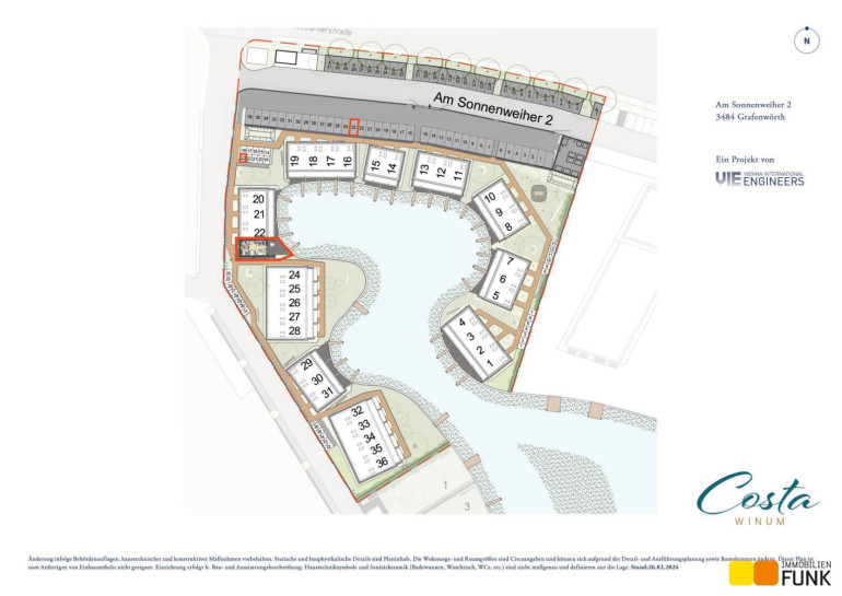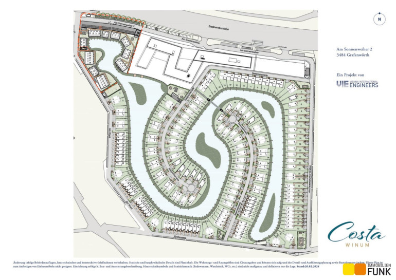 Sich den Traum vom Haus am See erfüllen und 365 Tage Urlaubsfeeling genießen. Das ist möglich im Sonnenweiher Grafenwörth, ca. 30 Fahrminuten von der Stadtgrenze Wiens entfernt, im Herzen der Region Wagram zwischen Wien und der Wachau. Ein nachhaltiges, gut durchdachtes Gesamtkonzept, erstklassige Architektur, hochwertige Ausstattung und viel Grünraum fördern das besondere Lebensgefühl am Sonnenweiher. Die Verkehrsanbindung Richtung Wien und Krems (S5, Stockerauer Schnellstraße) sowie nach St. Pölten (S33) ist ausgezeichnet. In der Gemeinde Grafenwörth gibt es ausreichend Einkaufsmöglichkeiten für Güter des täglichen Bedarfs, Kinderbetreuungseinrichtungen und Schulen. In diesem wunderbaren, regionalen Umfeld eingebettet, entstehen an einem mäanderförmig angelegten, ca. 36.000 m² großen See in mehreren Bauabschnitten insges. 170 Wohnimmobilien in Form von Einfamilien-, Doppel- u. Reihenhäusern im Eigentum sowie 36 kleine Seehäuser im Wohnungseigentum.