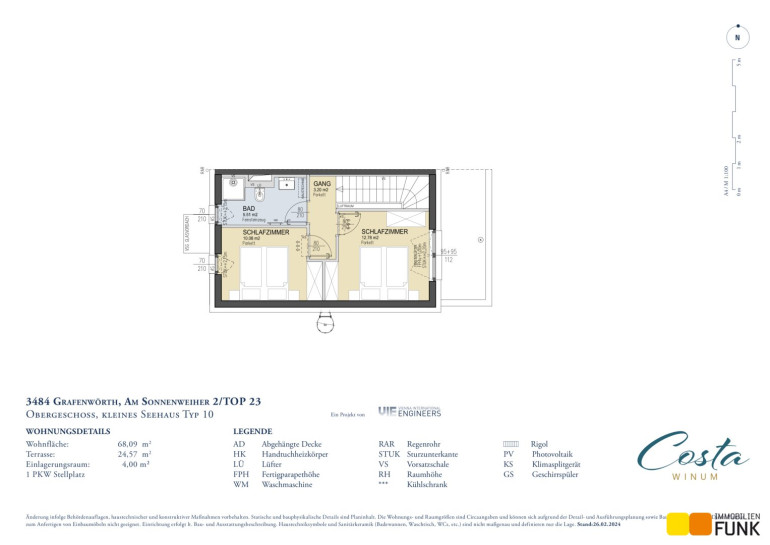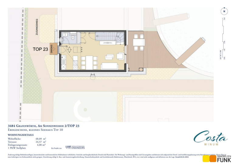 Unmittelbar bei der Zufahrt zu Am Sonnenweiher 2 finden Sie den zum Seehaus 23 gehörenden PKW-Abstellplatz. Von hier gelangen Sie über einen Zugangsweg zum Haus 23 mit dem dazugehörenden außenliegenden Einlagerungsraum nur wenige Schritte vom Hauseingang. Sie betreten das kleine Seehaus 23 in dem ca. 29,70 m² großen zentralen Wohnraum mit Zugang zur eigenen etwa 24 m² großen Lärchenholz-Terrasse mit Ihrem privatem Steg zum See. Linker Hand finden Sie das Gäste-WC und die Haustechnik. Unterhalb der Treppe, die Sie ins Obergeschoss führt, ist ein Abstellraum angeordnet. Im Obergeschoss erwarten Sie zwei Schlafzimmer (ca. 12,70 m² und 10 m²) und das etwa 5,50 m² großen Badezimmer mit Waschtisch, WC, Dusche, Fenster und Warmwasserspeicher.