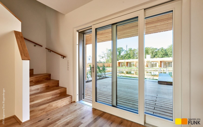 Jedes Ziegelhaus verfügt über Freiflächen in Form einer teilüberdachten Terrasse mit direktem Seezugang und privatem Steg. Ein KFZ-Stellplatz und eine große Gartenhütte gehören zu jedem Haus. Die Ausstattung ist vom Feinsten und präsentiert sich mit Heizung/Kühlung über Split-Klimageräte in den Wohnräumen, Photovoltaik-Anlage und Vorbereitung für eine E-Ladestation für PKW. Schöner Parkett in allen Wohnräumen, Feinsteinzeug in den Nassräumen, Markenprodukte bei Sanitärausstattung, Fußbodenheizung im Badezimmer, dreifach verglaste Holz-Alufenster und außenliegende Beschattung komplettieren das einzigartige Wohnerlebnis.