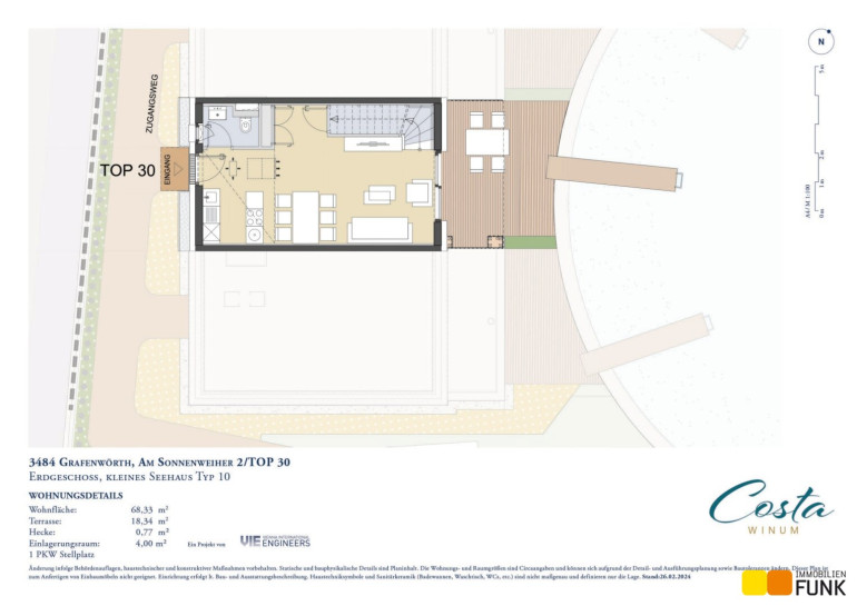 Unmittelbar bei der Zufahrt zu Am Sonnenweiher 2 finden Sie den zum Seehaus 30 gehörenden PKW-Abstellplatz. Von hier gelangen Sie über einen Zugangsweg zum Haus 30 mit dem dazugehörenden außenliegenden Einlagerungsraum nur wenige Schritte vom Hauseingang. Sie betreten das kleine Seehaus 30 in dem ca. 29,80 m² großen zentralen Wohnraum mit Zugang zur eigenen etwa 19 m² großen Lärchenholz-Terrasse mit Ihrem privatem Steg zum See. Linker Hand finden Sie das Gäste-WC und die Haustechnik. Unterhalb der Treppe, die Sie ins Obergeschoss führt, ist ein Abstellraum angeordnet. Im Obergeschoss erwarten Sie zwei Schlafzimmer (ca. 12,80 m² und 10,10 m²) und das etwa 5,50 m² großen Badezimmer mit Waschtisch, WC, Dusche, Fenster und Warmwasserspeicher.