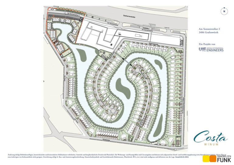 Sich den Traum vom Haus am See erfüllen und 365 Tage Urlaubsfeeling genießen. Das ist möglich im Sonnenweiher Grafenwörth, ca. 30 Fahrminuten von der Stadtgrenze Wiens entfernt, im Herzen der Region Wagram zwischen Wien und der Wachau. Ein nachhaltiges, gut durchdachtes Gesamtkonzept, erstklassige Architektur, hochwertige Ausstattung und viel Grünraum fördern das besondere Lebensgefühl am Sonnenweiher. Die Verkehrsanbindung Richtung Wien und Krems (S5, Stockerauer Schnellstraße) sowie nach St. Pölten (S33) ist ausgezeichnet. In der Gemeinde Grafenwörth gibt es ausreichend Einkaufsmöglichkeiten für Güter des täglichen Bedarfs, Kinderbetreuungseinrichtungen und Schulen. In diesem wunderbaren, regionalen Umfeld eingebettet, entstehen an einem mäanderförmig angelegten, ca. 36.000 m² großen See in mehreren Bauabschnitten insges. 170 Wohnimmobilien in Form von Einfamilien-, Doppel- u. Reihenhäusern im Eigentum sowie 36 kleine Seehäuser im Wohnungseigentum.