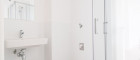 - Badezimmer mit Dusche, Waschbecken und Waschmaschinienanschluss
