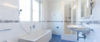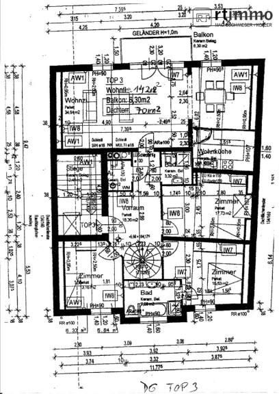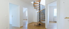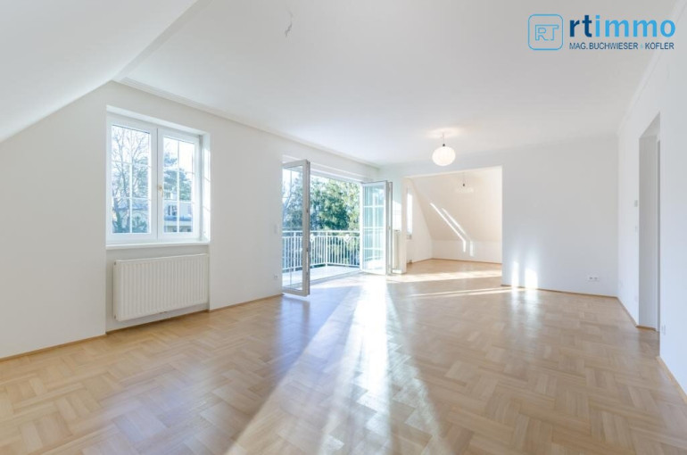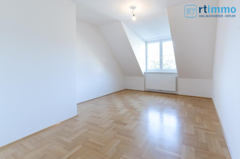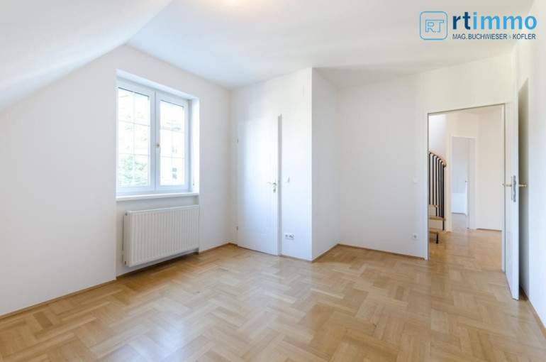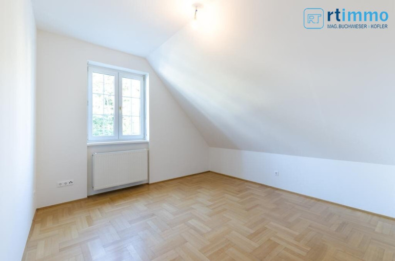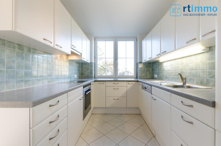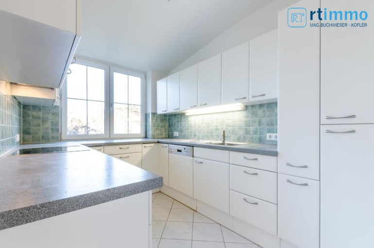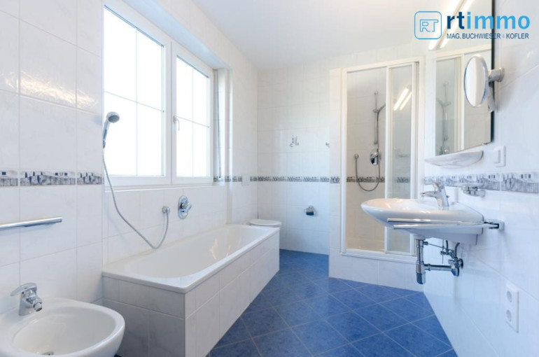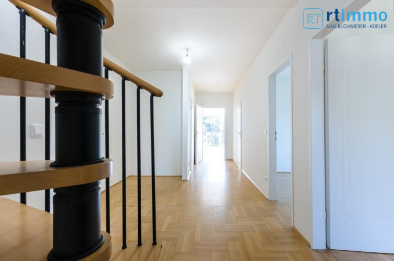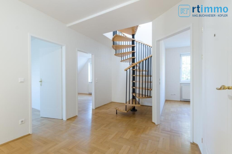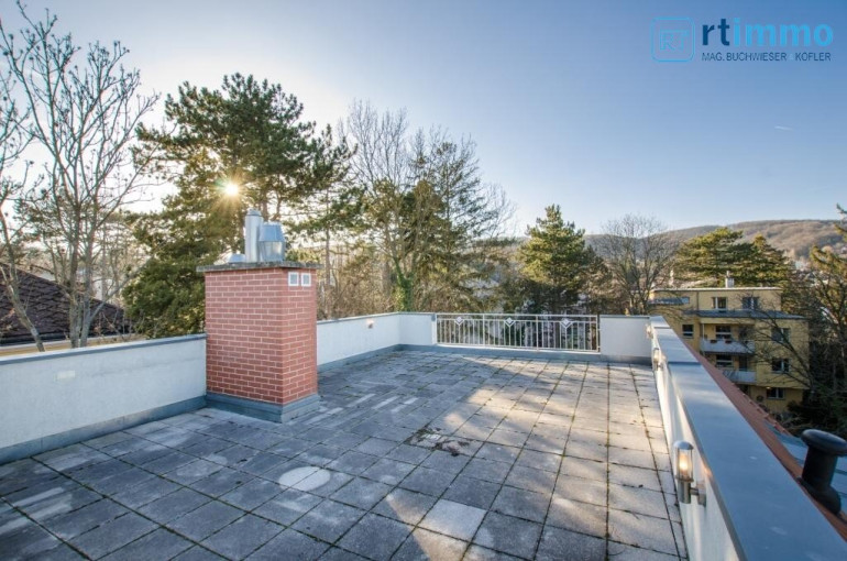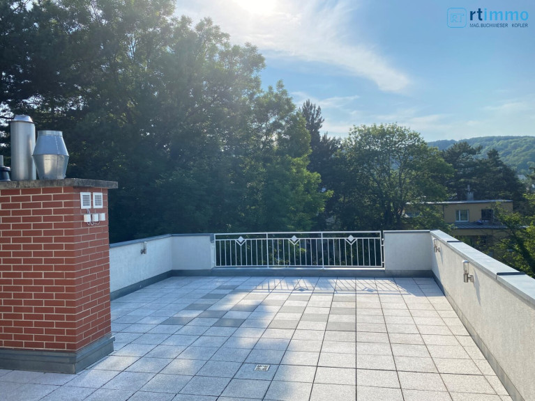 Die Dachterrasse erreichen Sie über eine Wendeltreppe vom Vorzimmer aus, sie ist uneinsehbar und hat einen Rundum-Weitblick. Das größere Bad verfügt über eine Wanne, extra Dusche, großes Fenster, Bidet und WC.