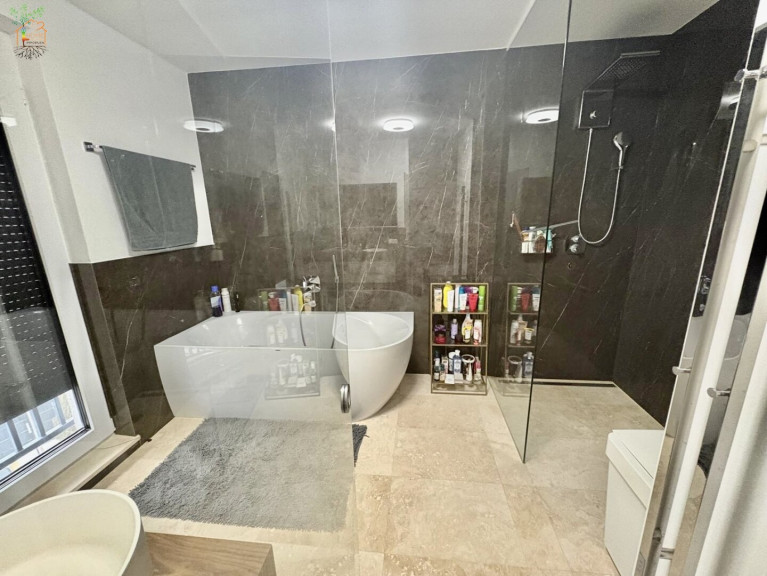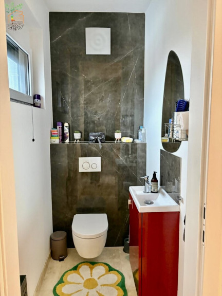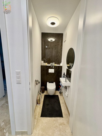 Von hier aus treten Sie direkt hinaus auf die Terrasse – der Übergang zwischen Drinnen und Draußen ist fließend. Ein praktischer Technikraum und ein Gäste-WC ergänzen diese Ebene perfekt. Für wohlige Wärme und ein nachhaltiges Gefühl sorgt die moderne Luft-Wasser-Wärmepumpe, die das Haus effizient beheizt.