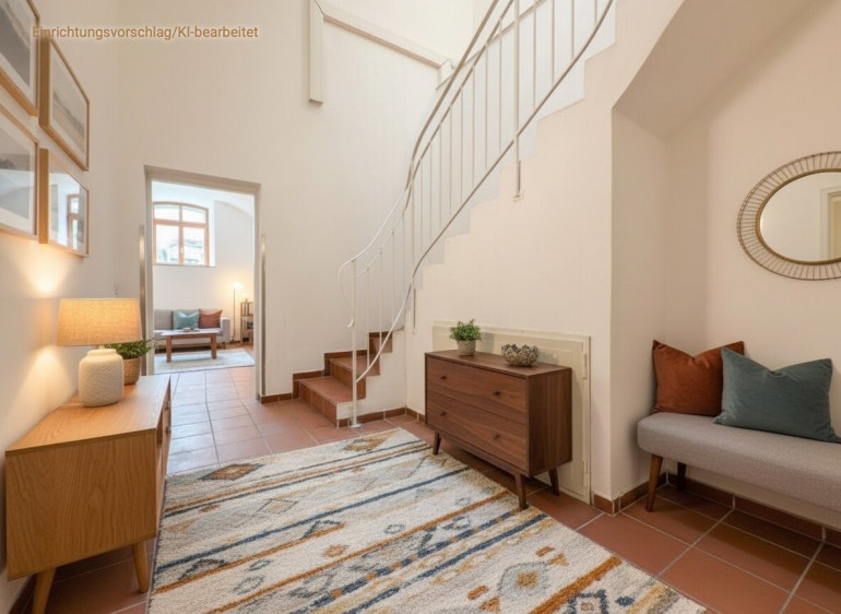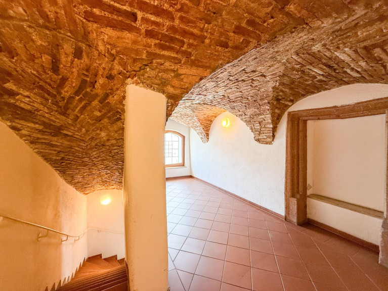 Über eine mit Cotto-Fliesen belegte Treppe gelangen Sie in den Halbstock mit Gäste-WC und Dusche und Abstellfläche. Im 3. Obergeschoss eröffnet sich ein offener, heller Wohnbereich, der das Herzstück der Wohnung bildet, mit Platz für eine große offene Küche. Das Galeriegeschoss unter dem Dach beherbergt den privaten Schlafbereich – ruhig gelegen, mit Blick auf die darunterliegenden Ebenen. Massive Mauern, stilvolle Gewölbe und ein durchdachter Grundriss machen dieses Objekt zu einem Ort des kreativen Schaffens und stilvollen Lebens – mitten im historischen Zentrum und dennoch mit modernem Wohnkomfort.