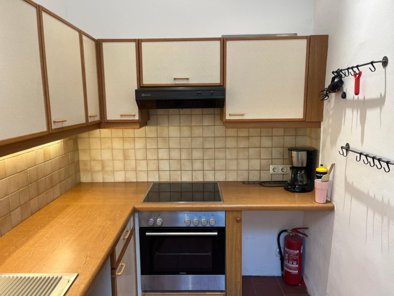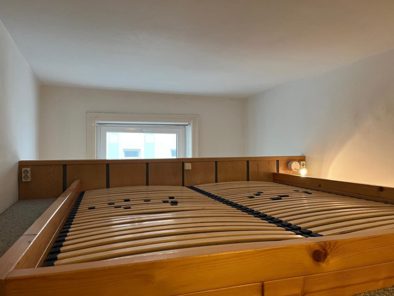 Wohnzimmer, Schlafzimmer mit fix eingebauter, professioneller Schallschutzkabine und darüberliegendem Schlafloft, separate Einbauküche, Vorzimmer,