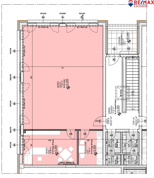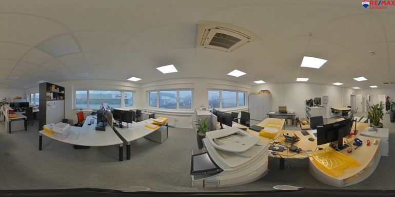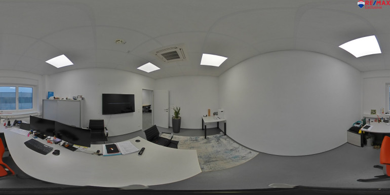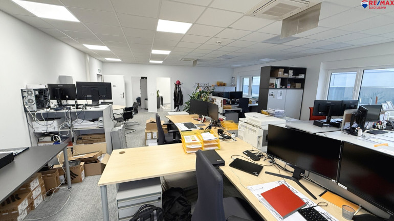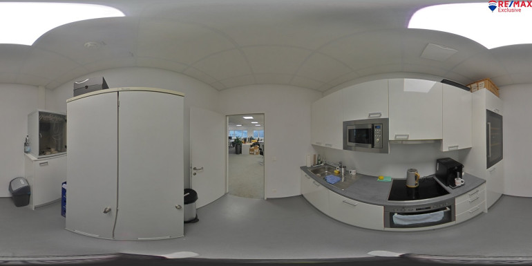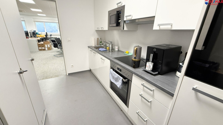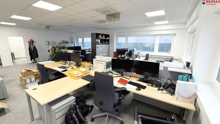 Das Büro im 1. OG verfügt über ca. 100 m² sowie einer Einbauküche.