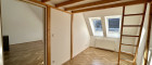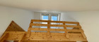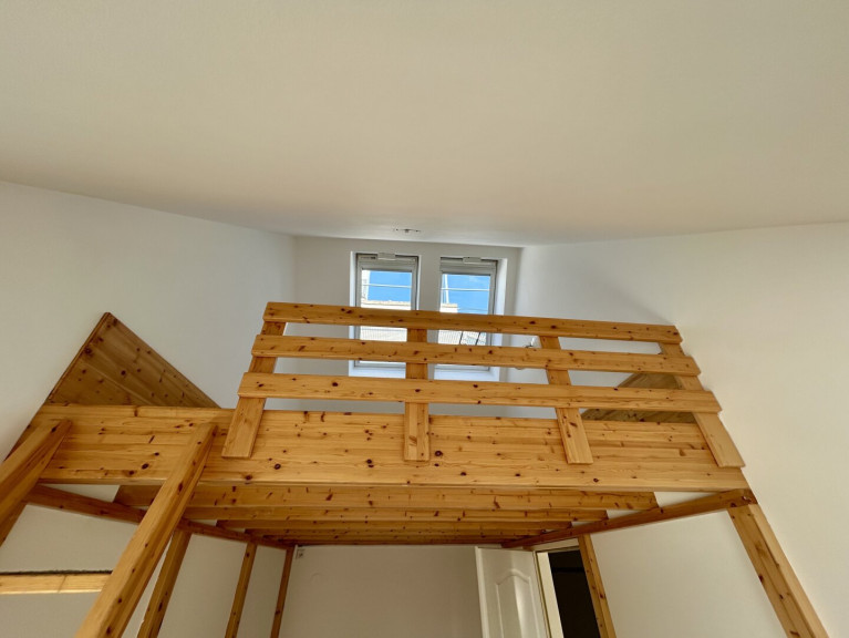 Vom Vorraum aus befindet sich rechter Hand ein Schlafzimmer, anschließend das Badezimmer sowie ein separates WC. Über den Gang gelangt man entweder in den Wohnbereich mit integrierter Küche oder über eine Holztreppe direkt auf die Dachterrasse. Hinter dem Wohnzimmer liegt ein weiteres Schlafzimmer. Dieses ist mit einer Hochbettkonstruktion mit einer Fläche von ca. 6,5 m² (zusätzlich zur Wohnfläche) ausgestattet, die aufgrund der vorhandenen Raumhöhe voll nutzbar ist.