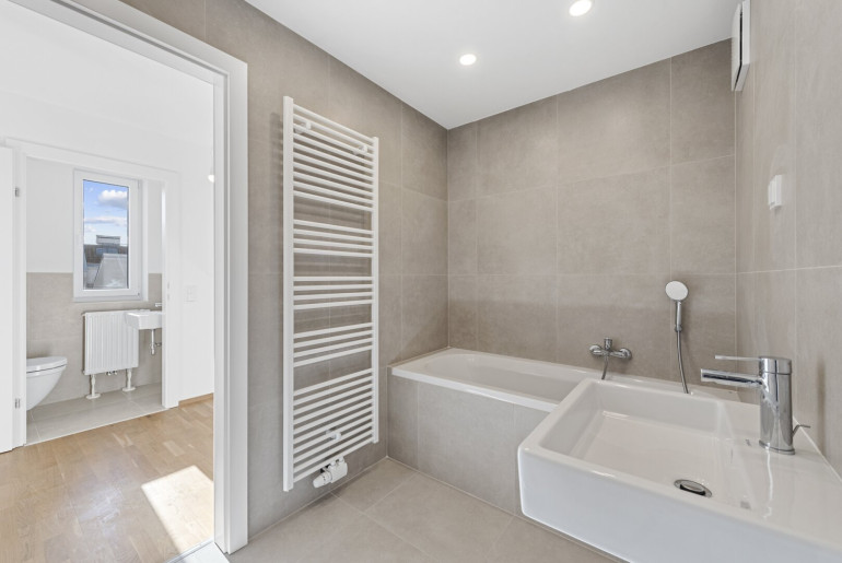 Im Inneren erwarten Sie schlüsselfertige Wohnungen, die mit attraktivem Eichenparkett, stilvoll verfliesten Bädern und vollausgestatteten Küchen ausgestattet sind. Die Dachgeschosswohnungen verfügen zusätzlich über Klimaanlagen der Premium-Marke Daikin, die auch an heißen Sommertagen für ein behagliches Wohnklima sorgen. Großzügige, jeweils den Wohnungen zugeordnete, Kellerabteile runden das Angebot ab.