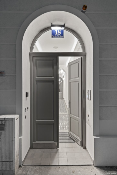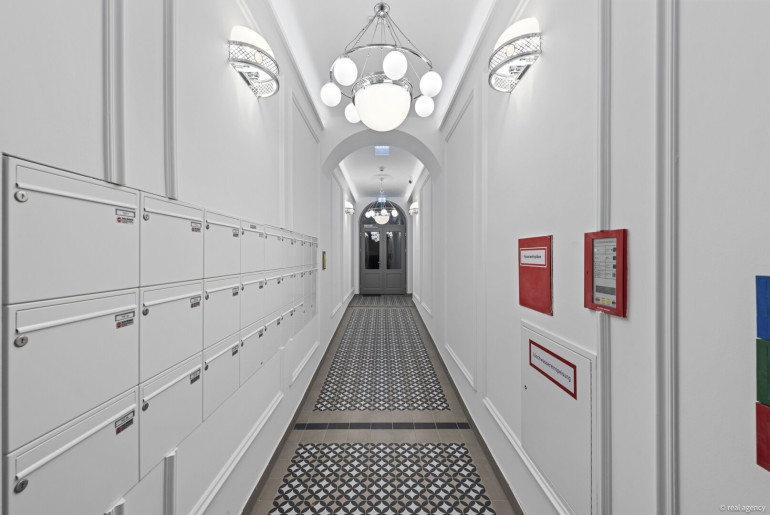 Der erste Eindruck lässt sofort erkennen, mit welcher Sorgfalt dieses Projekt umgesetzt wurde: Ein repräsentativer Entrée-Bereich mit kunstvollen Stuckelementen, indirekter Beleuchtung und dezent untermalter klassischer Musik empfängt Bewohner und Gäste gleichermaßen stilvoll. Die Gemeinschaftsflächen sind mit handverlegten Zementfliesen, typisch für die Wiener Altbauära, gestaltet – ein Detail, das die besondere Atmosphäre des Hauses zusätzlich unterstreicht.