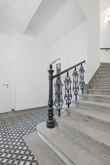 Der erste Eindruck lässt sofort erkennen, mit welcher Sorgfalt dieses Projekt umgesetzt wurde: Ein repräsentativer Entrée-Bereich mit kunstvollen Stuckelementen, indirekter Beleuchtung und dezent untermalter klassischer Musik empfängt Bewohner und Gäste gleichermaßen stilvoll. Die Gemeinschaftsflächen sind mit handverlegten Zementfliesen, typisch für die Wiener Altbauära, gestaltet – ein Detail, das die besondere Atmosphäre des Hauses zusätzlich unterstreicht.
