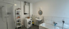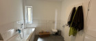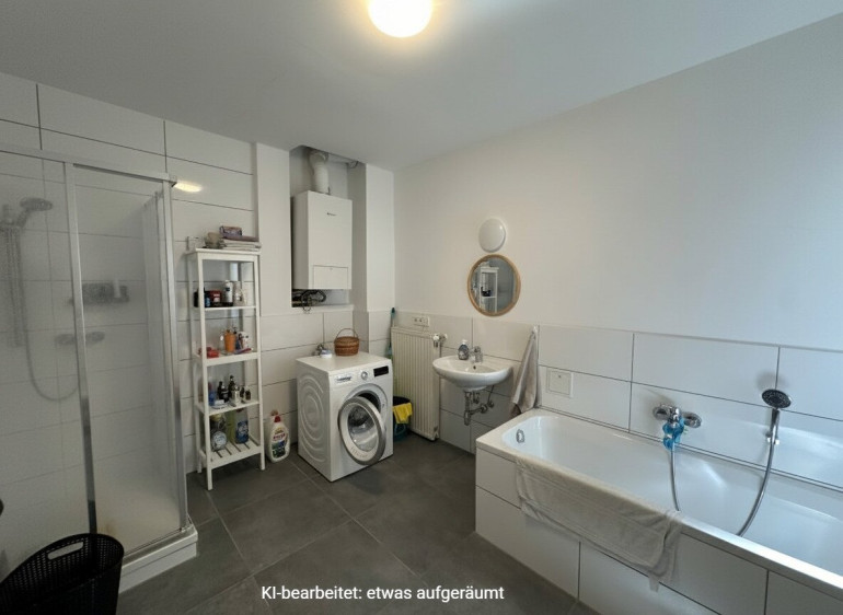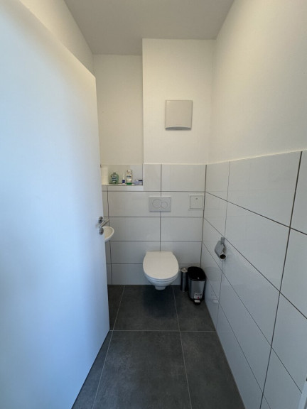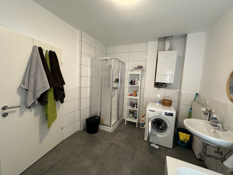 Beim Betreten werden Sie von einem einladenden Flur begrüßt, der rechterhand zu einem separaten WC mit Handwaschbecken führt. Nur wenige Schritte weiter, ebenfalls auf der rechten Seite, befindet sich das geräumige Badezimmer mit einer großzügigen Badewanne, einer Dusche, einem stilvollen Waschbecken, einem weiteren WC und einem praktischen Waschmaschinenanschluss.