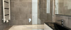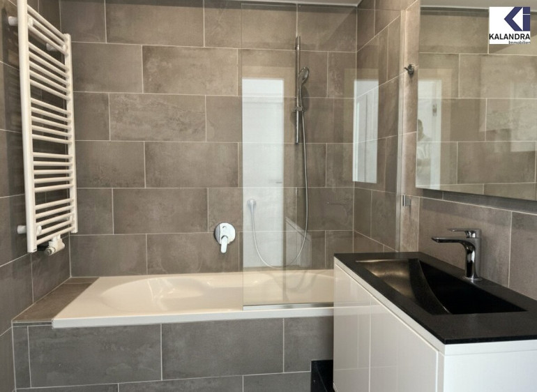 hochwertiges Badezimmer mit Verfliesung, Badespiegel, Badewanne und Handtuchradiator