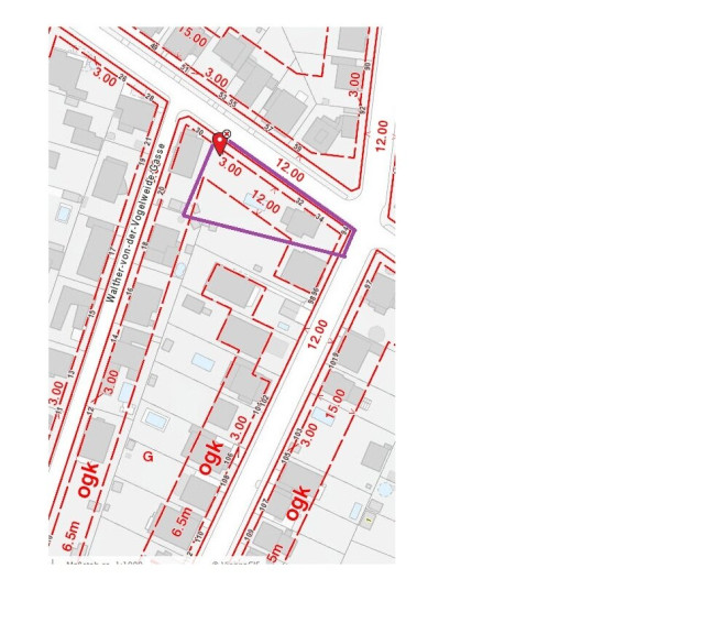 Das Grundstück umfasst 1.202 m² und ist gemäß Flächenwidmung der Bauklasse I (begrenzt auf 6,5 m Höhe) zugeordnet.
