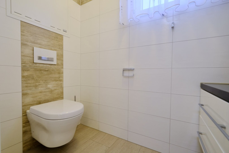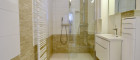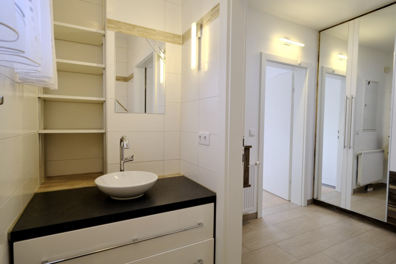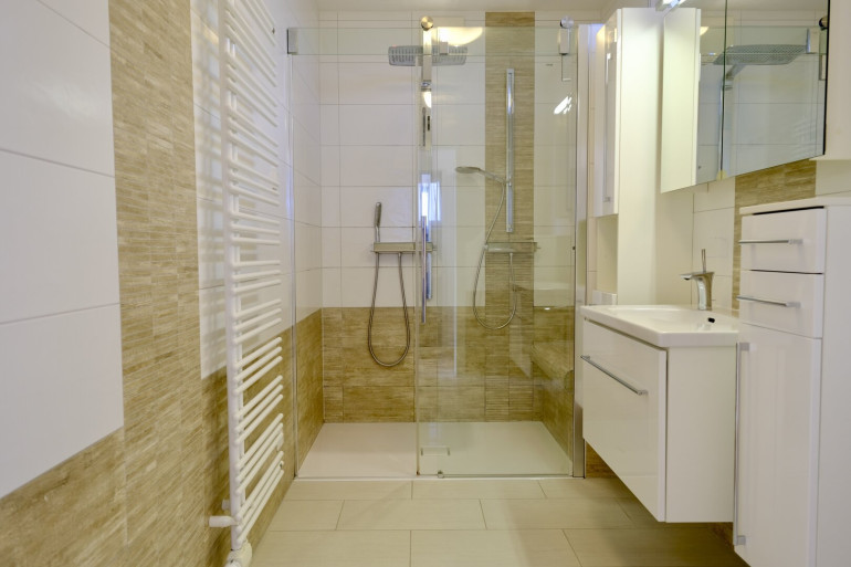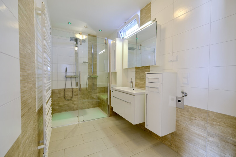 Das komfortable Wohlfühlbad überzeugt mit einem schicken Fliesendesign, schönen Amaturen und einer barrierefreien Walk-In-Dusche mit beheiztem Sitzplatz- eine kleine, persönliche Wohlfühloase für zu Hause. Ein geräumiger Vorraum und eine separate Toilette mit schön eingebauten Maßmöbeln ergänzen den hohen Wohnkomfort.