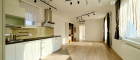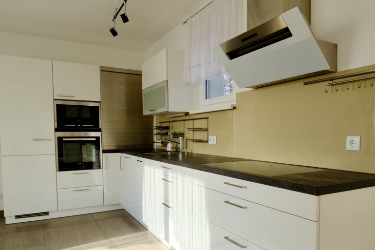 Edle, naturgeölte Eichendielen verleihen dem Wohnraum eine warme & behagliche Atmosphäre. Die stilvoll designte Markenküche von EWE fügt sich harmonisch in das Ambiente ein und begeistert mit einem klaren & modernen Küchendesign, einer luxuriösen Keramik-Arbeitsfläche, sowie einer stilvollen Glasrückwand im warmen Ockerton.