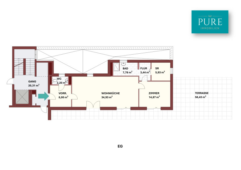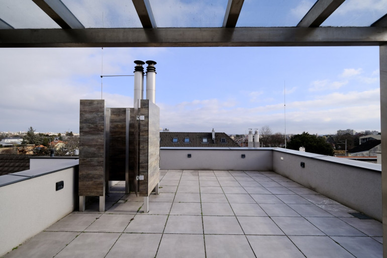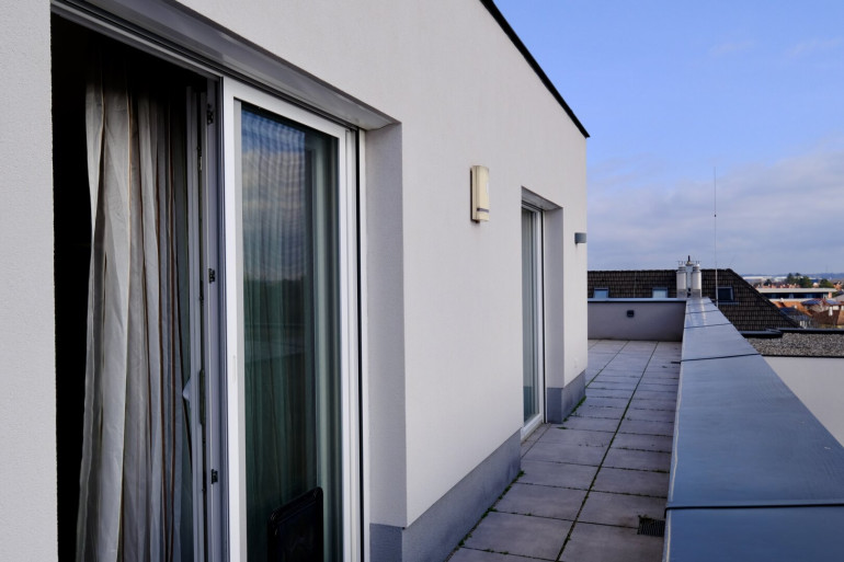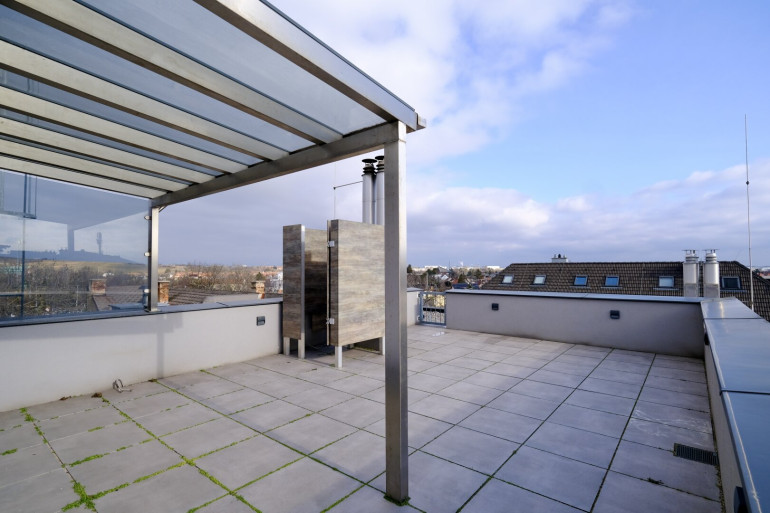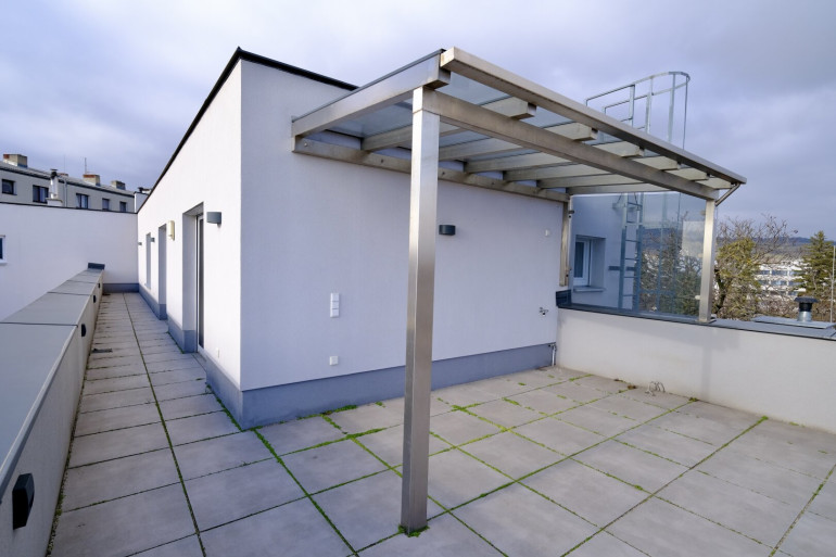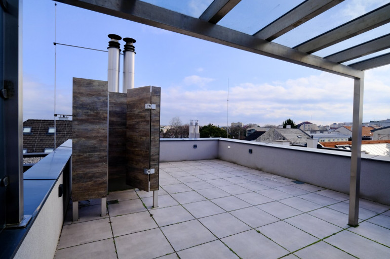 Der offene, schön angelegte Wohn- und Essbereich bildet das Herzstück der Wohnung und wird von einer beeindruckenden Dachterrasse mit modernen Feinsteinfliesen umrahmt. Sowohl vom Wohn- als auch vom Schlafzimmer gelangen sie direkt ins Freie. Zudem erweitert eine hochwertige & moderne Teilüberdachung den Wohnraum und ermöglicht ein Sitzen im Freien auch an Regentagen.