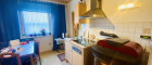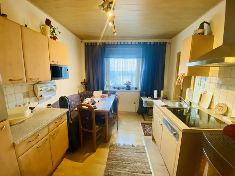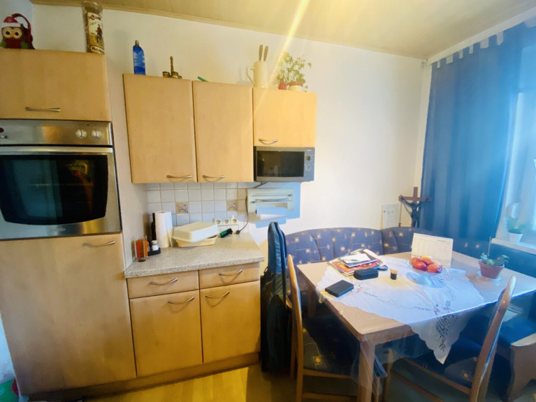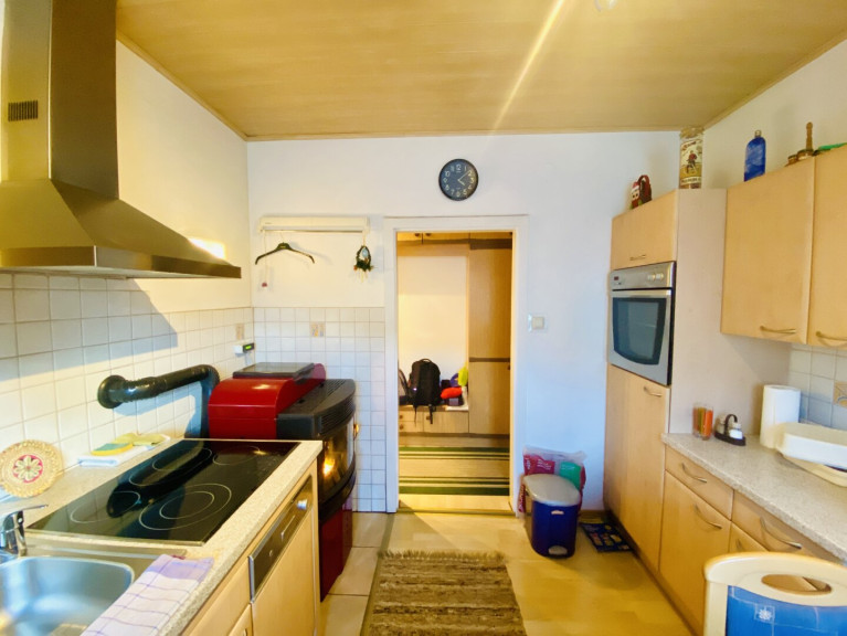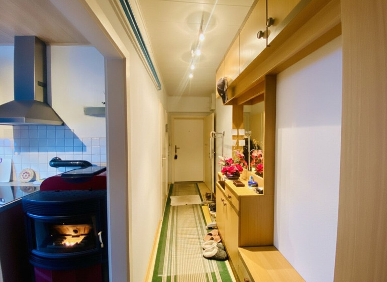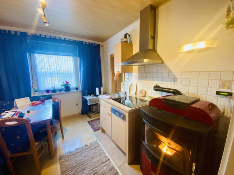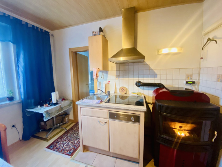 Die möblierte Küche ist mit einer gemütlichen Essecke ausgestattet und bildet gemeinsam mit dem Pelletsofen mit Sichtfenster das Herzstück der Wohnung. Der Ofen wurde 2006 vom Wohnungseigentümer angeschafft, ist programmierbar und wird mit Pellets beheizt. Die jährlichen Heizkosten belaufen sich derzeit auf rund € 500,–, was diese Heizlösung besonders wirtschaftlich macht.