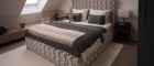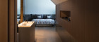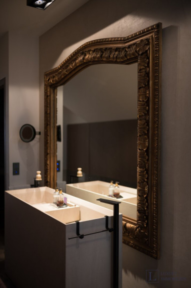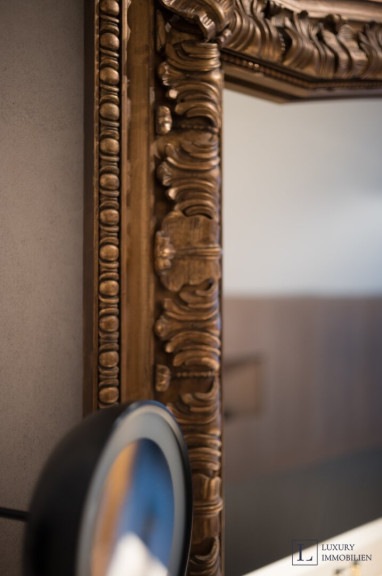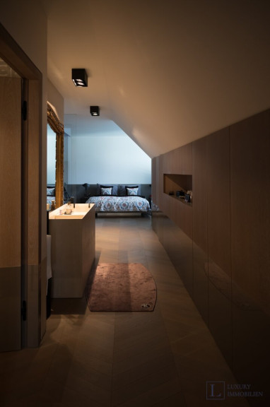 Das Hauptschlafzimmer ist ein ruhiger Rückzugsort mit viel Stauraum, während maßgefertigte Schranklösungen in der gesamten Wohnung außergewöhnliche Ordnung und Eleganz schaffen. Der abgetrennte Schlafbereich mit einer spektakulären begehbaren Dusche biete sehr viel Ruhe und Komfort.
