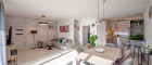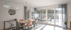 Im Erdgeschoss bildet der offen gestaltete Wohn-Ess-Bereich das Herz des Hauses. Große Terrassenschiebetüren öffnen den Raum zur Terrasse, in den Garten und zum See und schaffen eine fließende Verbindung zwischen Innen- und Außenbereich. Hier ist Platz für gemeinsames Leben – für Mahlzeiten mit den Lieben, Gespräche und entspannte Stunden im Familienalltag.