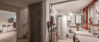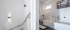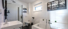 Das stilvolle Bad überzeugt mit Walk-in-Dusche, Badewanne und Doppelwaschbecken und ist funktional wie ästhetisch auf die Bedürfnisse einer Familie abgestimmt.