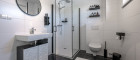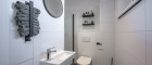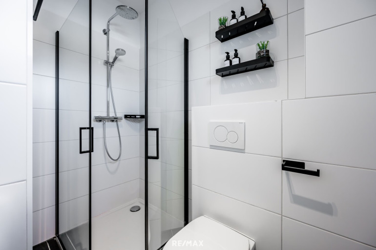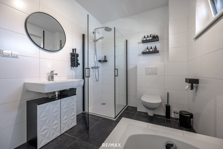 Bereits im Eingangsbereich des Hauses steht ein Gäste-WC mit zusätzlicher Dusche zur Verfügung – ein durchdachtes Detail für Alltag und Besuch.