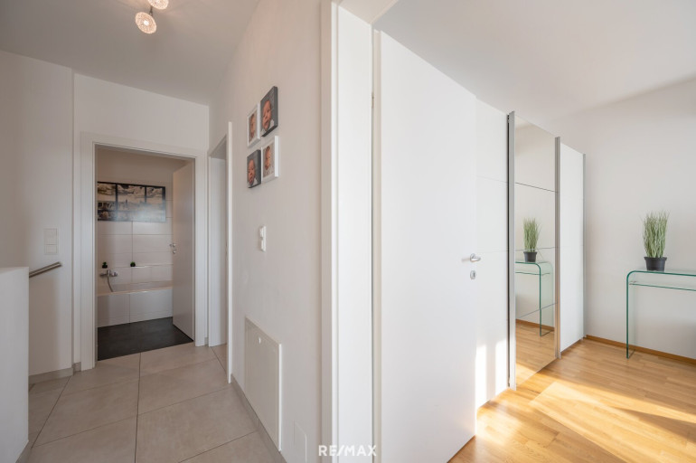 Auch technisch ist das Haus auf dem neuesten Stand und zukunftsorientiert ausgestattet. Beheizt wird über eine moderne Luft-Wasser-Wärmepumpe in Kombination mit Fußbodenheizung, die in allen Wohnbereichen für angenehme, gleichmäßige Wärme sorgt. Eine kontrollierte Wohnraumlüftung trägt ganzjährig zu einem gesunden Raumklima bei, während eine Klimaanlage an warmen Tagen zusätzlichen Wohnkomfort bietet.