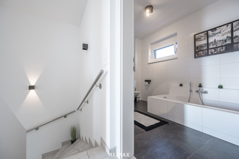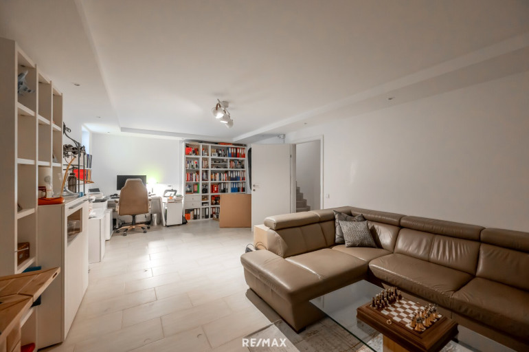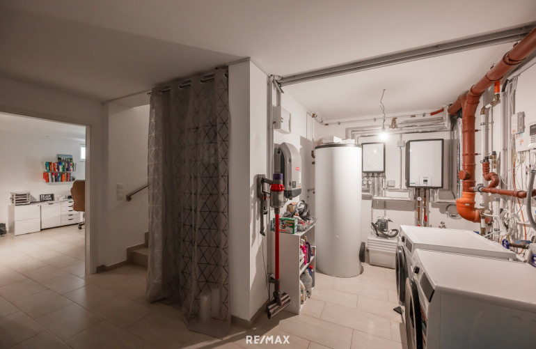 Ein besonderes Highlight ist der Wohnkeller, der weit mehr bietet als klassische Nutzfläche. Hier findet sich ausreichend Platz für einen großzügigen Family-Room im amerikanischen Stil – ideal zum Fernsehen, Entspannen und Chillen. Zusätzlich stehen Flächen für einen ausgestatteten Schrankraum, Sauna, Fitnessgeräte oder ein ruhiges Homeoffice zur Verfügung. Selbstverständlich sind auch funktionale Bereiche wie Lager- und Abstellräume, Technikraum sowie Platz für Waschmaschine und Trockner sinnvoll integriert.