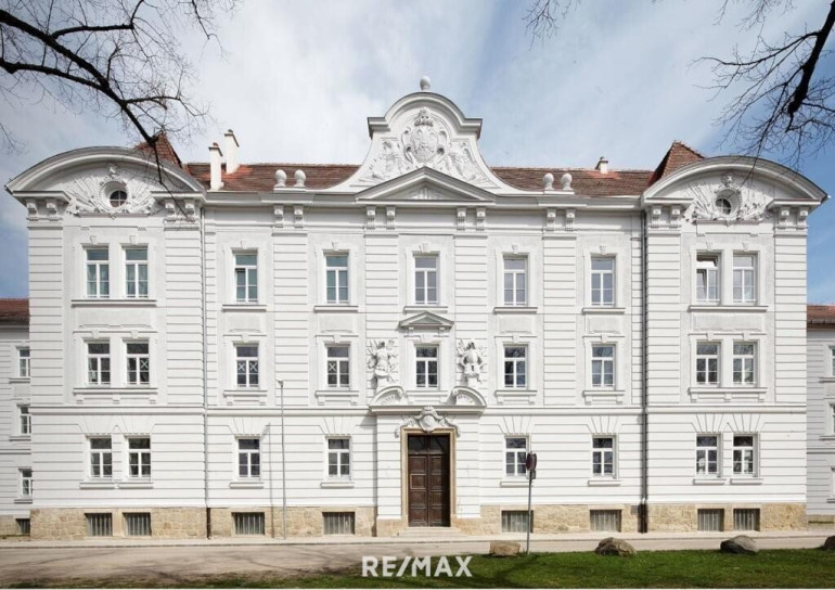 Sie betreten das palaisartige Gebäude über ein imposantes Eingangstor und eine mächtige Treppe führt Sie in den 2. Stock.