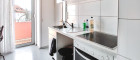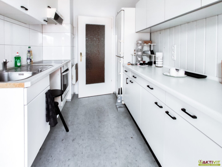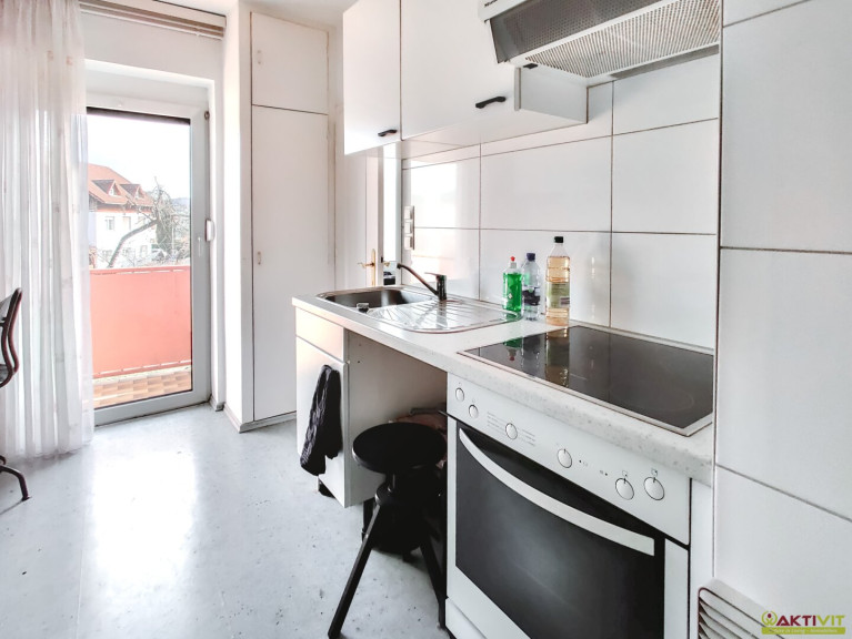 Die Küche verfügt über einen direkten Zugang zum Balkon und bietet zudem den Zugang zum Badezimmer, welches mit Fenster und Dusche ausgestattet ist.