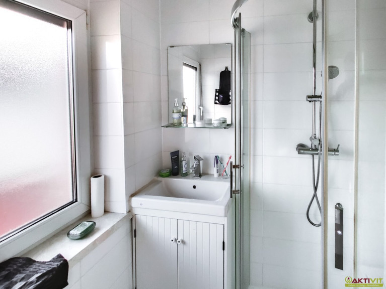 Fliesen, Laminatboden, Parkett, Fernwärme, Einbauküche, Bad mit Fenster, Dusche